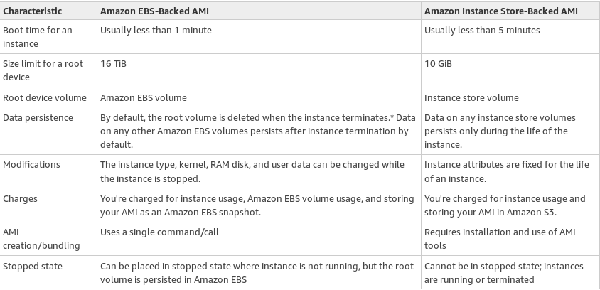 En AWS más precisamente dentro del servicio EC2, cuando creamos una AMI tambien estamos creando y almacenando un volumen, esto también es conocido como el Root Device de dicha AMI, el storage de dicho volumen se puede hacer usando Amazon EBS-Backed AMI esto es un volumen EBS a partir de un snapshot, la otra es usando Amazon Instance Store-Backed AMI que es básicamente un volumen creado a partir de un template almacenado en un bucket S3, a continuación se puede ver en el siguiente cuadro la diferencia entre ambos métodos de storage de root device (fuente: AWS oficial):
