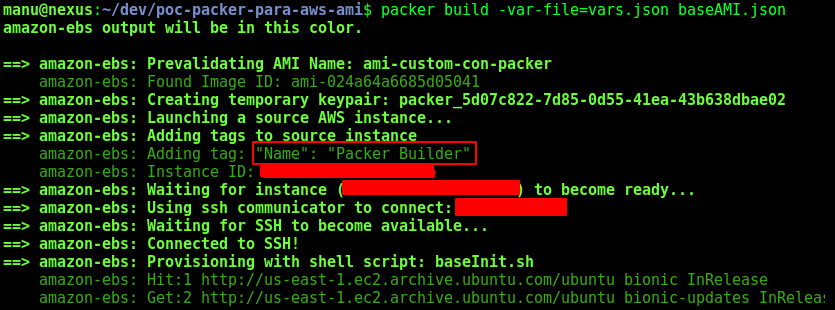 Luego se conecta vía ssh a la máquina Packer Builder y ejecuta el provisioner (en el ejemplo es nuestro script bash).