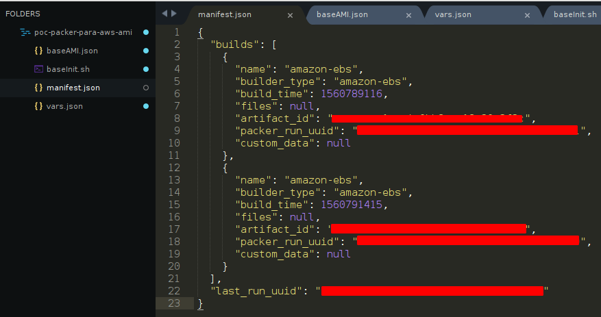 Por último hace un clean-up de la instancia Packer Builder junto con los volumes, keypairs etc, y levanta el post-processor de hecho podemos ver en nuestro directorio de trabajo que se creó el archivo manifest.json con el detalle de los artifacts creados.