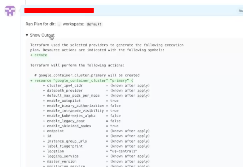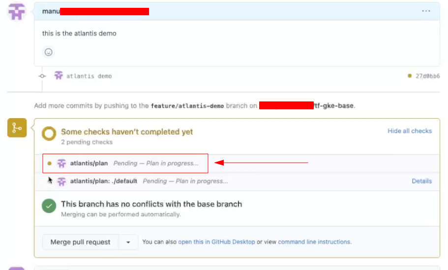 podemos expandir el output del plan y revisarlo en detalle antes de hacer el apply, lo mas lindo de esto, es que tendremos todo el detalle en la PR, es decir, todos los miembros de nuestro equipo pueden ver y analizar el tf plan, además de aprobar o no esos cambios, se puede jugar bastante con Atlantis en conjunto con las branches policies, merge strategies y demas