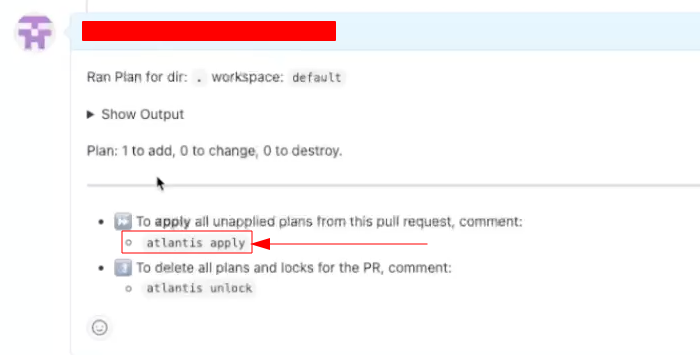 al finalizar va a escribir en forma de comentarios de la PR el output completo además de los next steps del workflow, si queremos aplicar el tf plan lo podemos hacer escribiendo como comentario la instrucción “atlantis apply” (en lugar de terraform apply):