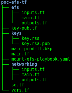 Vamos a armar los módulos con sus respectivos inputs main y outputs, un módulo para levantar todo el networking, un módulo para construir el EFS con su respectivo MountTarget, y el file main.tf donde vamos a invocar estos módulos y por último construir 2 instancias EC2 para que consuman nuestro EFS.