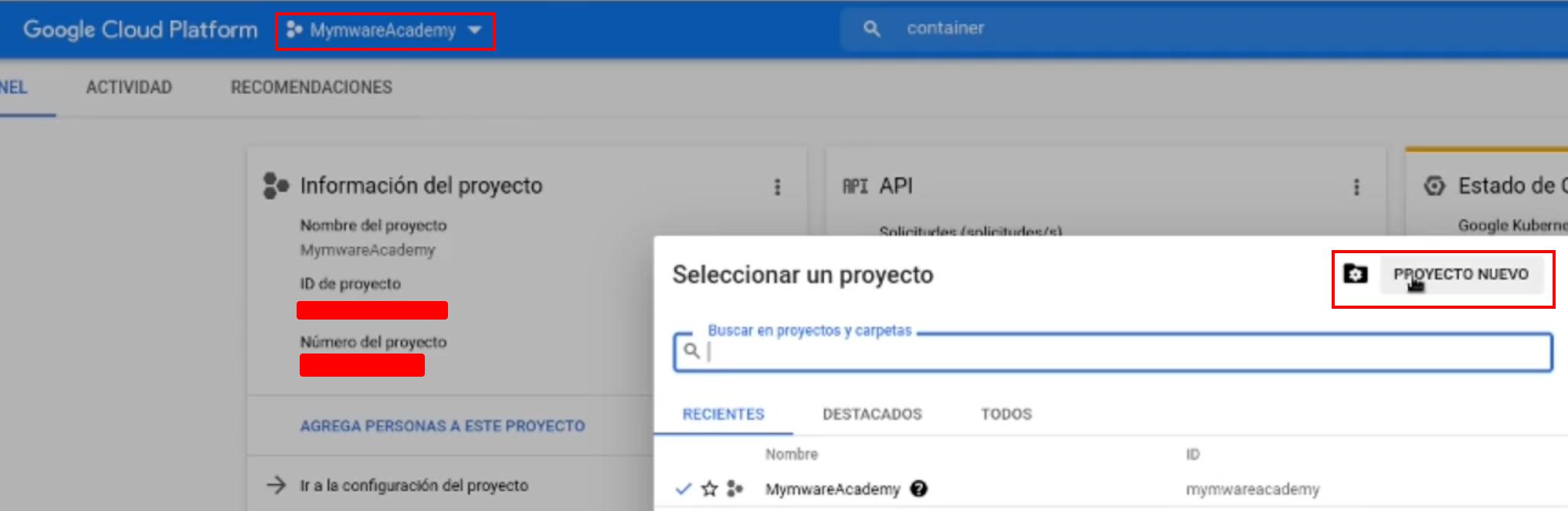 Lo primero que tenemos que hacer es elegir en qué proyecto vamos a trabajar, GCP organiza todos los recursos en proyectos, podemos trabajar sobre el proyecto default que nos ofrece la plataforma, o podemos crear uno de pruebas y luego eliminarlo cuando no lo necesitamos más etc.