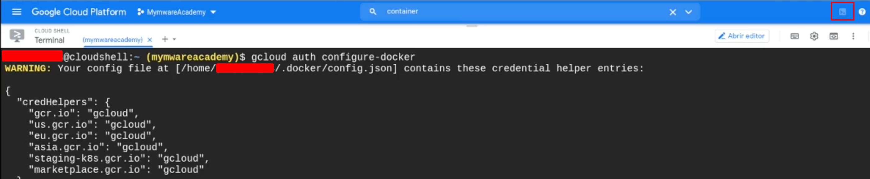 Una vez habilitada la API de GCR vamos a hacer clic en el botón activar cloudshell en la esquina superior derecha de nuestro panel de GCP y se nos va a abrir una sesión de linea de comandos en nuestro browser