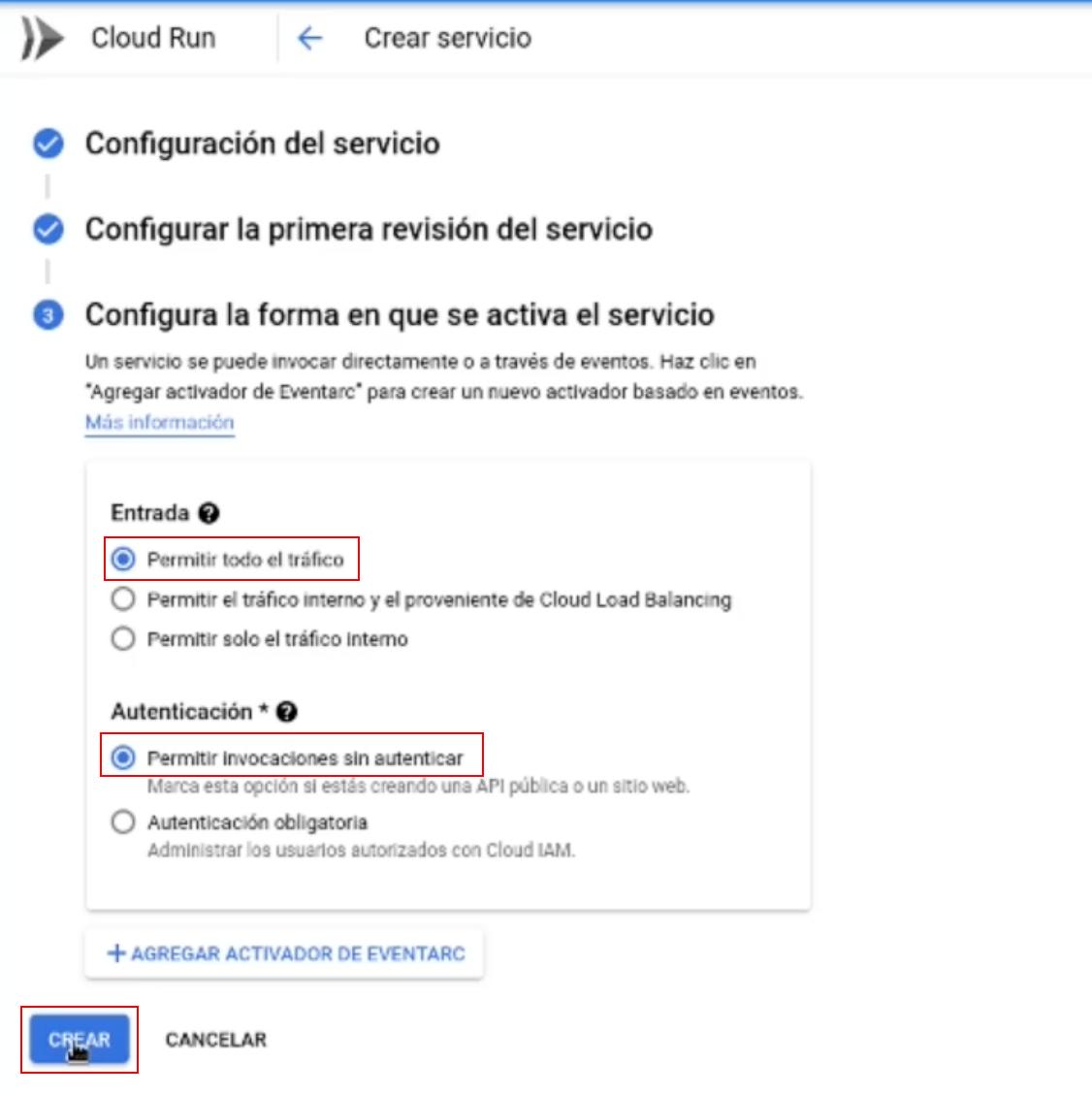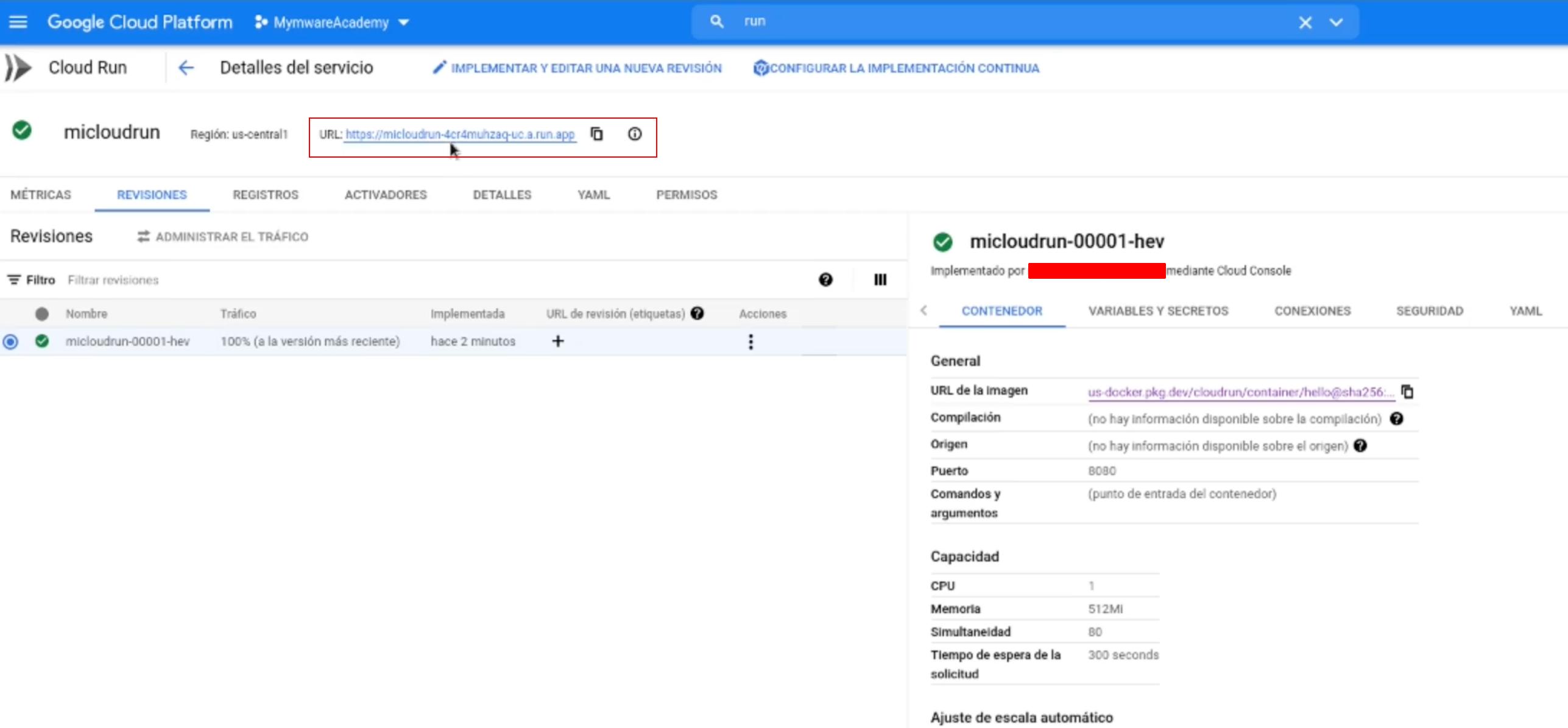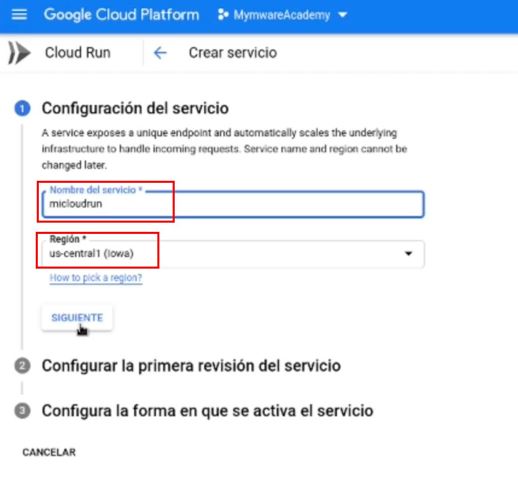 En tres simples pasos tendremos todo funcionando, en primer lugar vamos a elegir un nombre y una region para nuestro servicio de Cloud Run