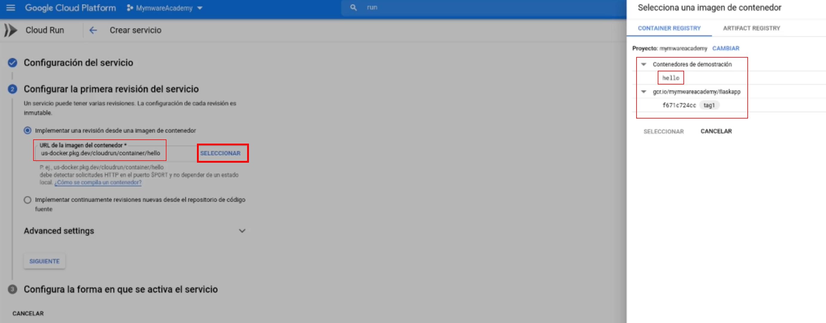 Luego debemos indicarle a Cloud Run donde se encuentra la imagen de contenedor que deseamos utilizar, podemos pegar la URL de un repo directamente, o podemos darle clic al botón seleccionar, veremos que gcp nos ofrece la posibilidad de utilizar la imagen de nuestra flaskapp que acabamos de subir a GCR, o también podemos seleccionar una app demo llamada hello, vamos a ir por esa opción.