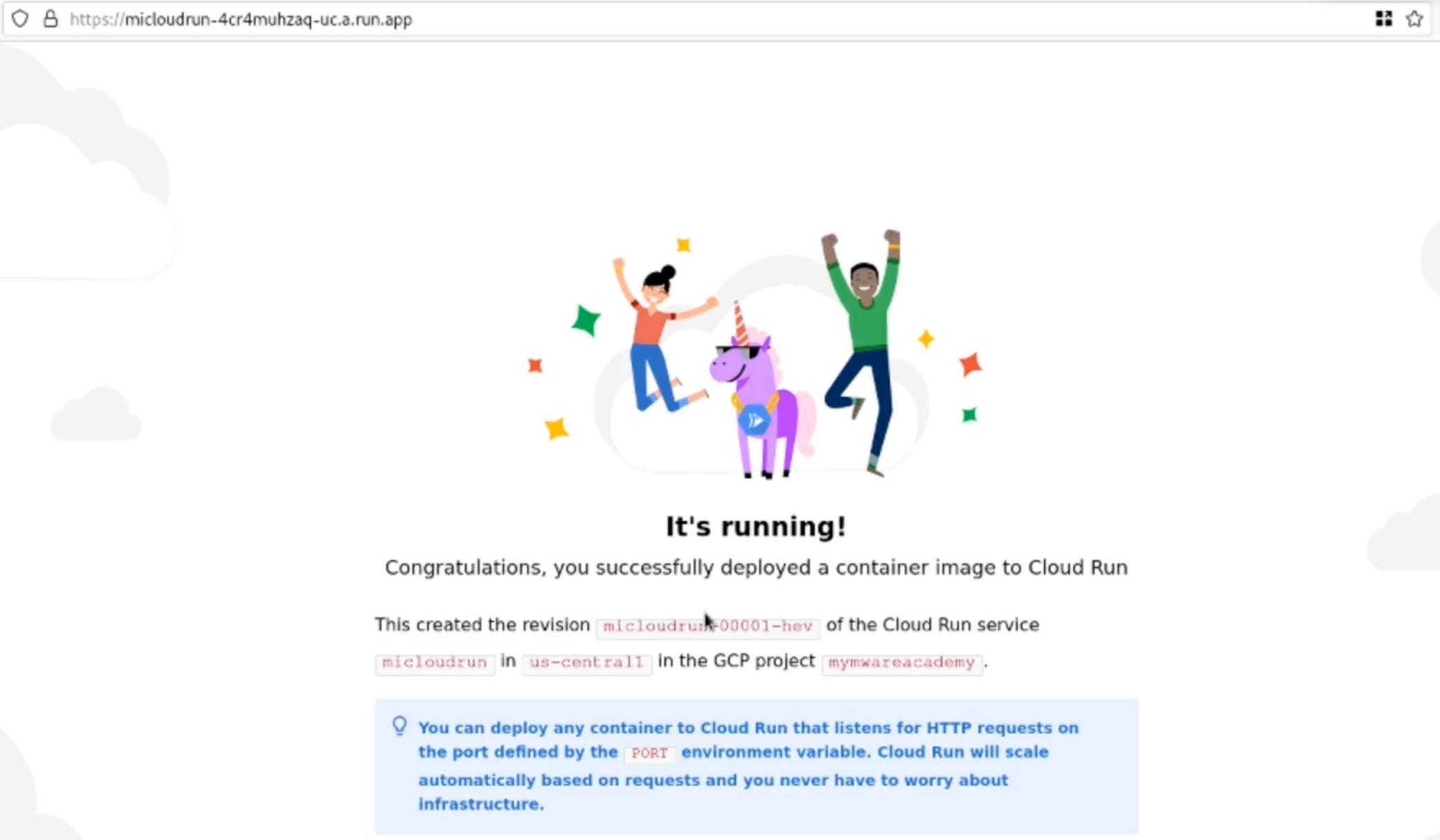 Una vez en verde nuestro servicio, podemos hacer clic en la URL que nos provee el dashboard de Cloud Run para ver el resultado.