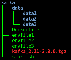 FROM java:8 MAINTAINER Juan Matias Kungfu de la Camara Beovide <juan.delacamara@3xmgroup.com> ENV KAFKA_RELEASE_ARCHIVE="kafka_2.11-2.3.0.tgz" RUN mkdir /kafka /data /logs # Copy Kafka binary distribution COPY ${KAFKA_RELEASE_ARCHIVE} /tmp WORKDIR /tmp # Install Kafka to /kafka RUN tar -zx -C /kafka --strip-components=1 -f ${KAFKA_RELEASE_ARCHIVE} && \ rm -rf ${KAFKA_RELEASE_ARCHIVE} COPY start.sh /kafka/start.sh # Set up a user to run Kafka RUN groupadd kafka && \ useradd -d /kafka -g kafka -s /bin/false kafka && \ chown -R kafka:kafka /kafka /data /logs && \ chmod ug+rx /kafka/start.sh USER kafka ENV PATH /kafka/bin:$PATH WORKDIR /kafka CMD ["./start.sh"]- Crear los envfiles con el siguiente contenido: