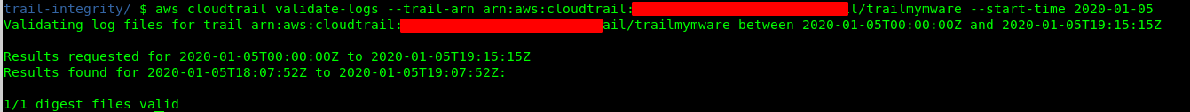 $ aws cloudtrail validate-logs --trail-arn REEMPLAZAR --start-time START-TIME