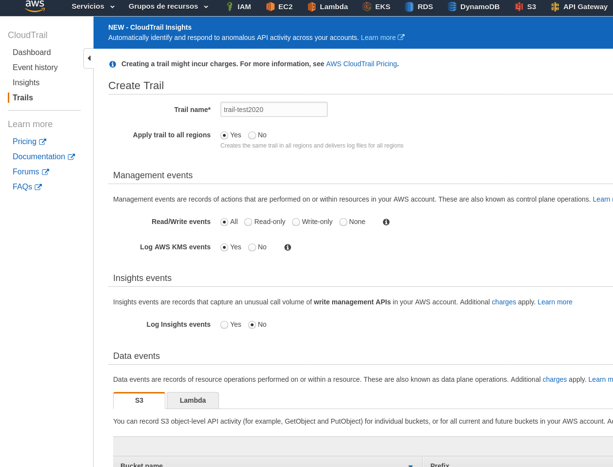En primer lugar levantamos un Trail, indicamos el bucket donde queremos que vaya toda la info logueada y luego nos aseguramos que la opcion Enable log file validation este prendida: