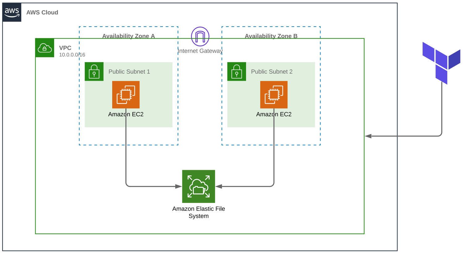 Tenemos un típico esquema MultiAZ de dos niveles (AZa y AZb) con una instancia EC2 en cada una, las cuales van a consumir/escribir datos en EFS, cabe aclarar que EFS está fuera de las AZ que vamos a crear, ya que al ser un servicio totalmente administrado, aws se encarga de replicar cada objeto del filesystem (cada directorio, archivo y enlace) en varias AZ, lo que creamos nosotros en cada una de las AZ donde van a vivir las instancias EC2 son los destinos de montaje o MountTarget (una interfaz de red que nos va a permitir comunicarnos con el EFS), podemos dejar que aws asigne automáticamente la IP del punto de montaje o podemos también especificarla nosotros, cuando creamos un EFS por consola web, el wizard de aws nos crea automáticamente un destino de montaje en todas las AZ de la VPC elegida, nosotros lo a hacer a traves de Terraform.