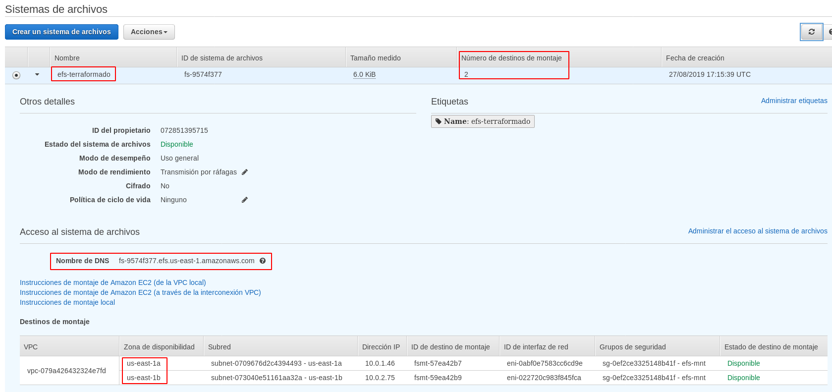 Ya tenemos levantada nuestra arquitectura, podemos observar el proceso y el resultado en la consola de aws, por ejemplo les dejo dos imágenes de los recursos EC2 y EFS: