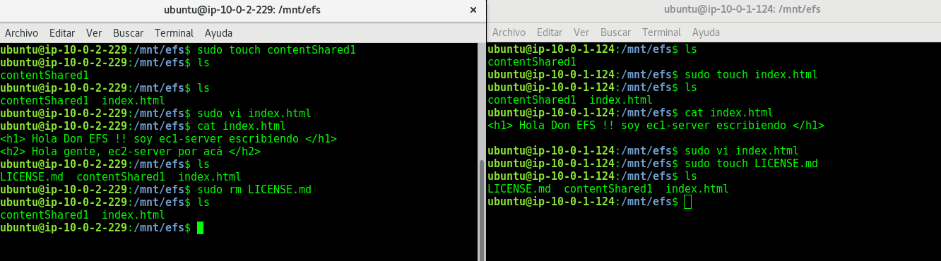 Ahora vamos a poder escribir, leer, borrar etc desde ambas instancias a un mismo volumen EFS: