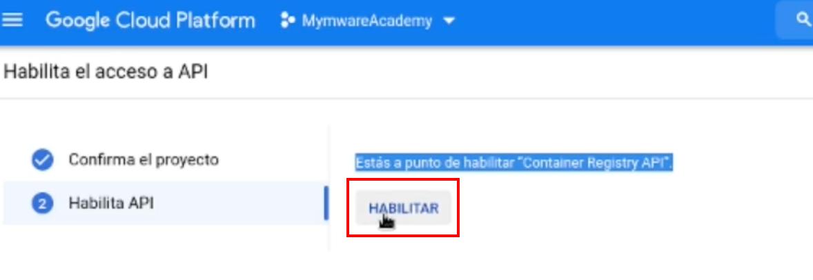 Vamos a buscar container registry en el buscador de servicios y como es común en GCP, antes de comenzar a utilizar un determinado servicio, debemos habilitar la API del mismo, lo hacemos dándole clic a habilitar y luego vamos a poder comenzar a utilizar GCR.
