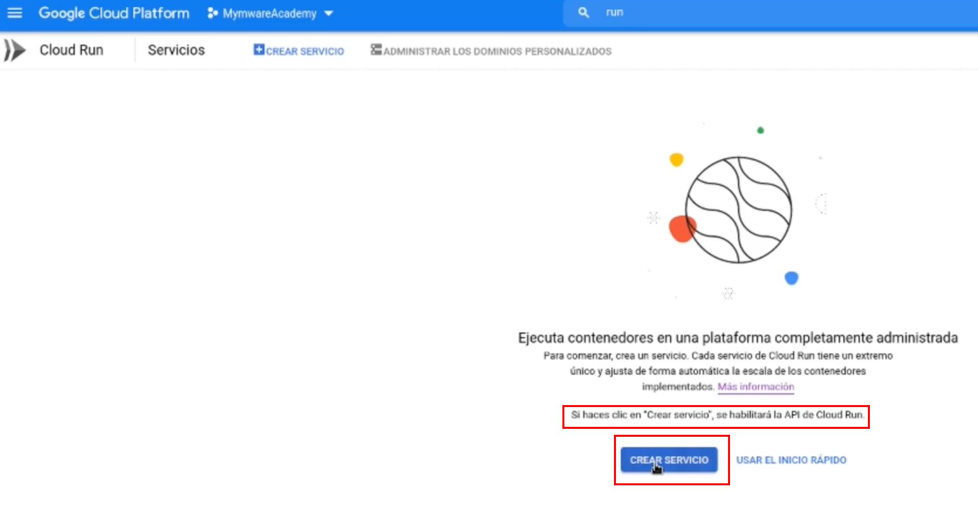 Ahora vamos con la parte más divertida, en nuestro cuadro de búsqueda del dashboard de GCP escribimos run y seleccionamos el servicio Cloud Run, en esta ocasión no hace falta habilitar la API del servicio por separado, simplemente lanzamos el wizard de servicio de Cloud Run y el mismo botón activa la API e inicia el asistente.