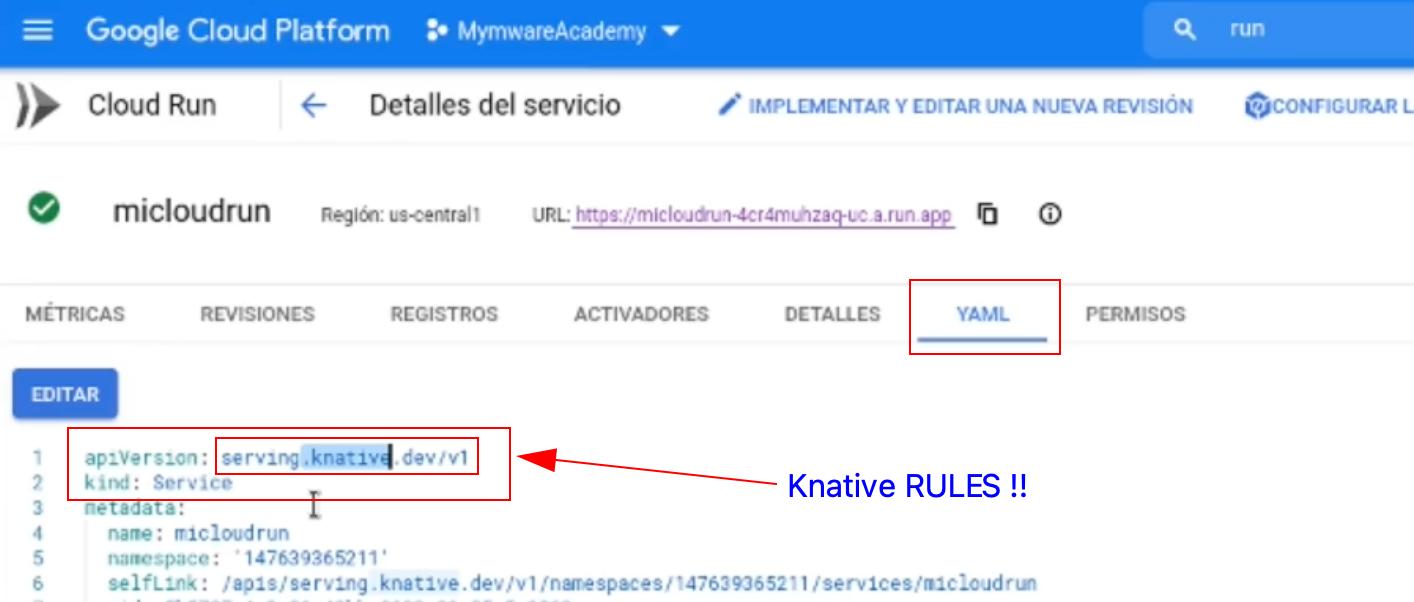 Cloud Run lo dice abiertamente, y la magia de este servicio ocurre gracias a una herramienta más que interesante llamada Knative la cual básicamente permite correr cargas de tipo Serverless en un cluster de Kubernetes (si… una hermosa locura) en la pestaña de YAML de nuestro servicio Cloud Run podemos ver el manifest de definición de nuestro servicio como un objeto de la api de Knative, sin dudas una herramienta que merece su propio curso completo.