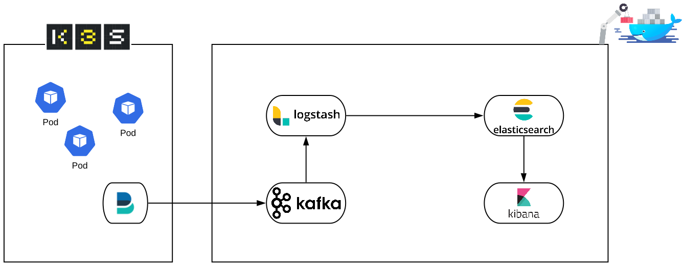 De izq a der, en esta POC vamos a tener nuestro cluster k8s soportado en la practica herramienta k3s de Rancher, dentro del cual vamos a deployar filebeat, básicamente lo que hace filebeat es capturar todos los logs del cluster y enviarlos a un destino en particular (output) que en este caso será el Kafka dockerizado. Luego tenemos nuestros containers Docker, Kafka para los que no lo conocen es un gestor de colas, en nuestro esquema, kafka va a recibir los logs que envía filebeat y los va a almacenar, nada más, así de sencillo. Logstash será el encargado de consumir los datos de Kafka, puede o no hacer algún tratamiento de esos datos, y se los envía a Elasticsearch para su almacenamiento en forma de índice y en formato JSON (Javascript Object Notation). Elasticsearch básicamente es un potente motor de base de datos orientado al almacenamiento y tratamiento de logs, en este punto, Elasticsearch va a almacenar nuestros logs y los disponibilizará mediante su API para cualquiera sea el consumidor de estos datos, en este caso Kibana. Con Kibana vamos a visualizar los datos almacenados en Elasticsearch, mapeando los índices de Elasticsearch con los index-patterns de Kibana. De esta manera vamos a tener un esquema de monitoreo de logs de kubernetes en tiempo real, con la posibilidad de realizar búsquedas, crear dashboards o triggerear alertas.