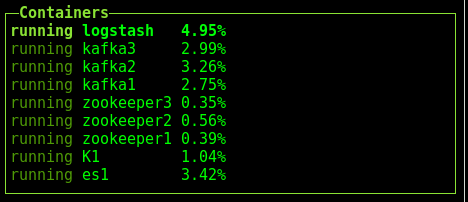 los cuales son: ES, Kibana, Logstash y los 6 containers involucrados en la gestión de colas Kafka.