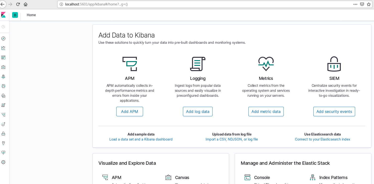 Comprobamos que levantó correctamente accediendo a http://localhost:5601 en el browser: