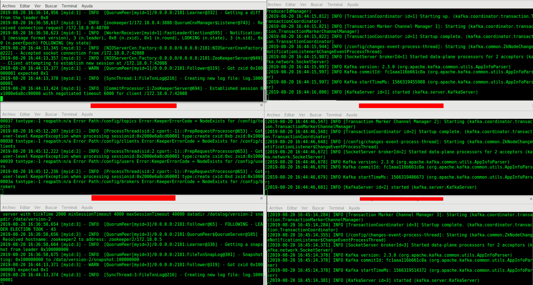 En este punto ya tendremos levantado nuestro cluster Kafka con Zookeeper como coordinador y gestor de workloads, y tendremos 6 terminales corriendo en modo debug para ver el comportamiento de los nodos Kafka y Zookeeper en conjunto: