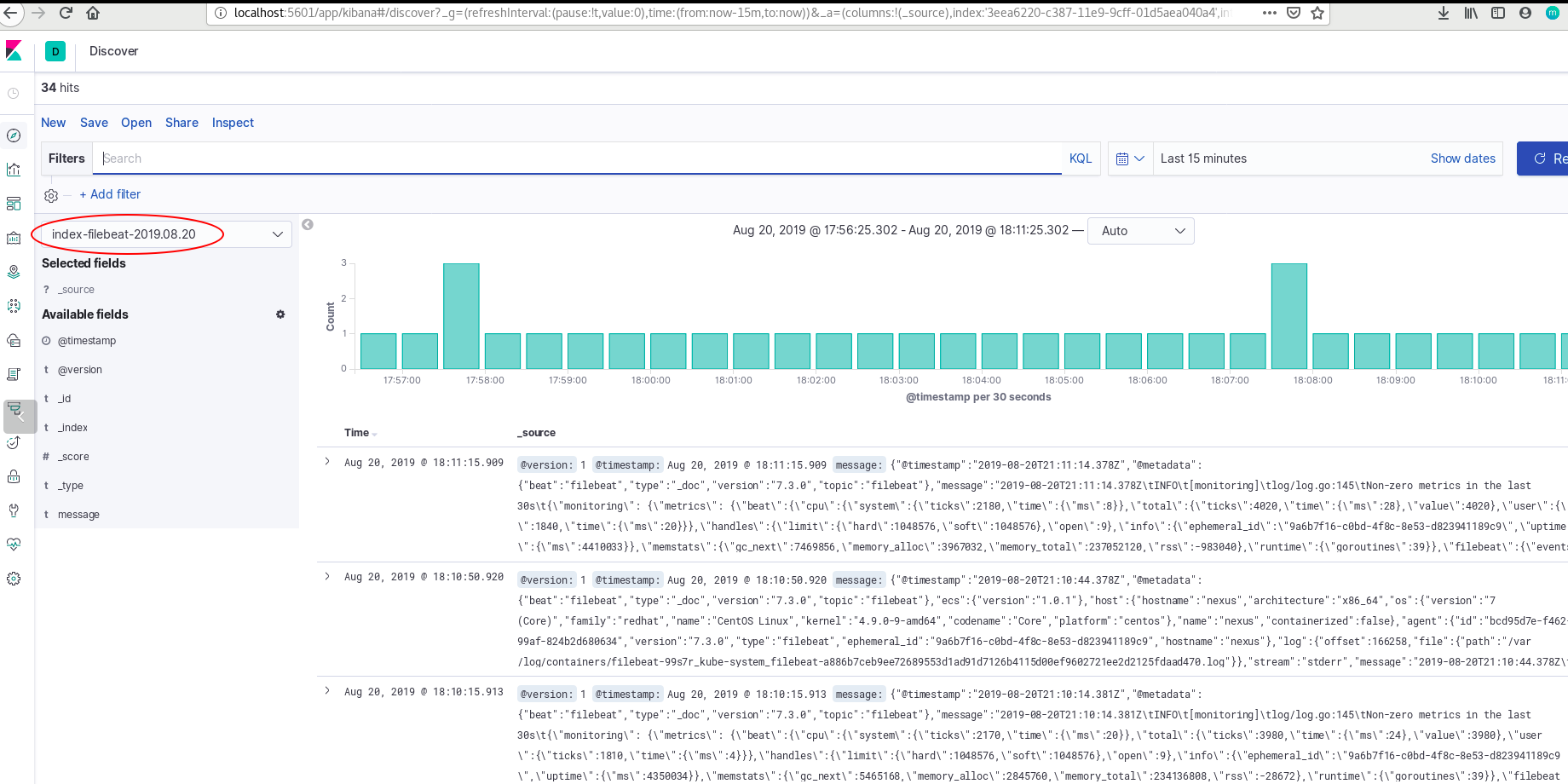 Abrimos Kibana y vamos a la sección Managment->Index patterns->Create index pattern y seleccionamos nuestro índice index-filebeat-fecha, listo, ahora si vamos al Discover de Kibana, vamos a ver como los logs de nuestro cluster k8s comienzan a llegar en tiempo real.