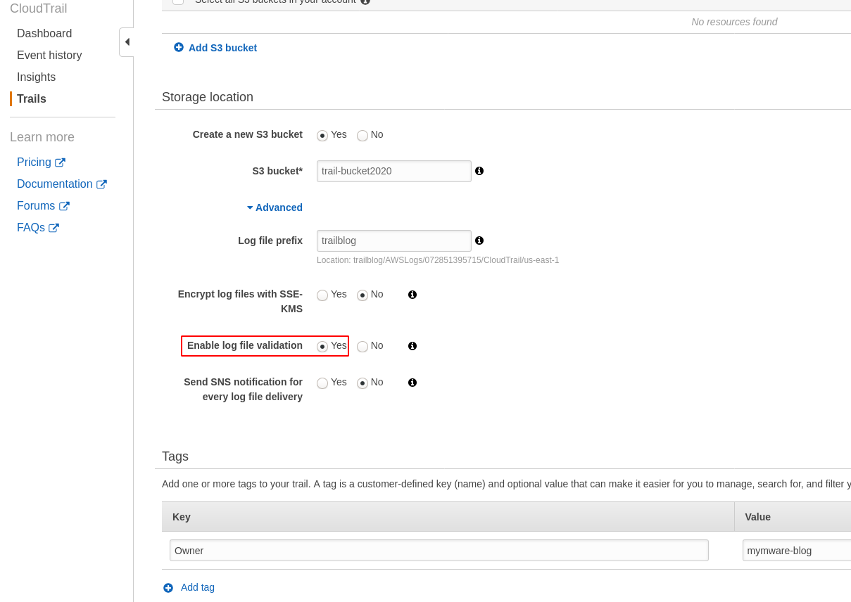 En primer lugar levantamos un Trail, indicamos el bucket donde queremos que vaya toda la info logueada y luego nos aseguramos que la opcion Enable log file validation este prendida: